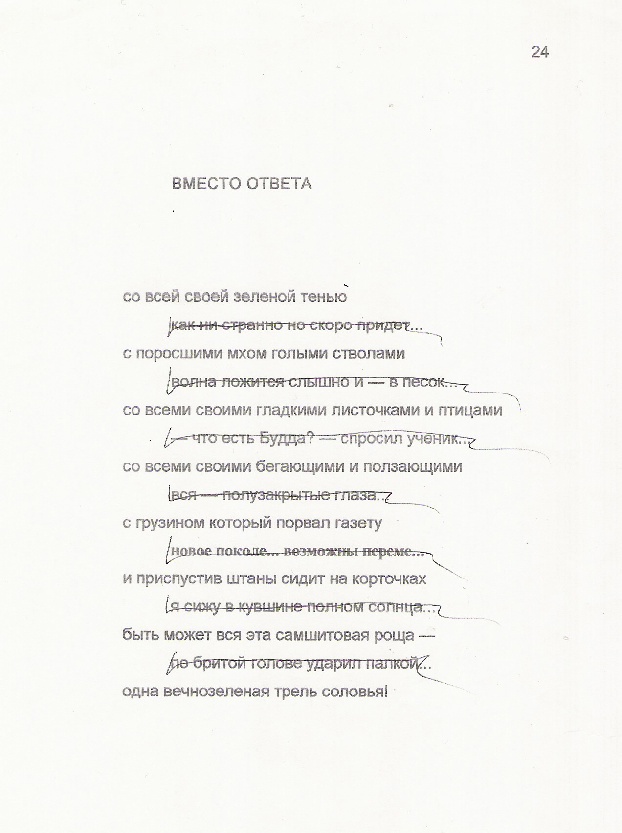 страницы его манускрипта. Опечаток Сапгир не нашел, но над стихотворением "Вместо ответа" крепко задумался, а потом попросил меня взять авторучку и вычеркнуть в оригинале строки, которые он хотел убрать. Затем он взял у меня лист (факсимиле которого прилагается к этой статье), перечитал стих и сказал: "Да, теперь это правильно звучит". Я взял этот лист с собой, чтобы внести правку. В таком виде текст и был напечатан.